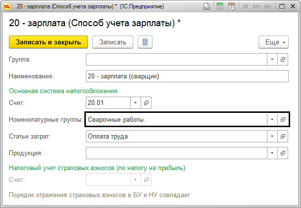 При начислении заработной платы также ведут раздельный учет. Если работник непосредственно занят на выпуске продукции и его зарплата является прямыми затратами, то в «Способах учета зарплаты» указывают номенклатурную группу. Применяют счет 20. Его субконто будет соответствующая группа, в нашем примере «Сварочные работы».