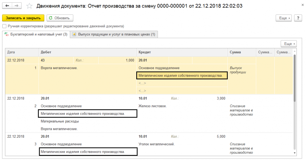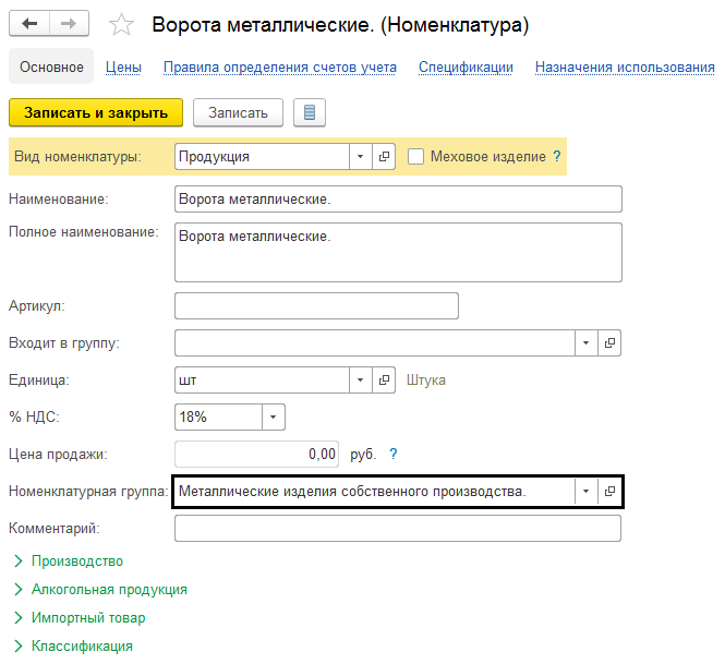 Теперь рассмотрим номенклатурные группы при выпуске продукции собственного производства на примере позиции «Ворота металлические». Она находится в группе «Металлические изделия собственного производства».