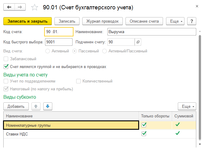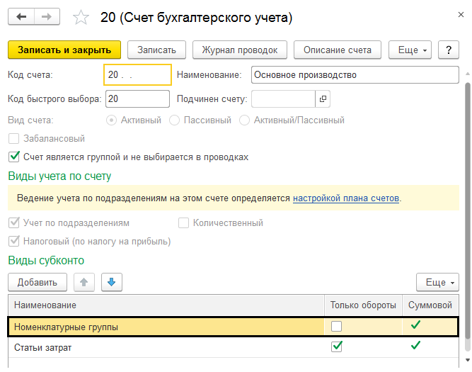 Рассматриваемое понятие «номенклатурная группа» не имеет никакого отношения к группам, содержащимся в справочнике «Номенклатура», которые нужны для объединения позиций справочника. Сейчас имеются в виду составляющие аналитики некоторых счетов. По ним можно настроить учет затрат, выручки, себестоимости продукции, работ, услуг с детализацией. Речь идет о счетах 20 «Основное производство» и 90 «Продажи». Они предназначены для отражения выручки и формирования себестоимости. Для их аналитического учета предусмотрено субконто  «Номенклатурные группы».