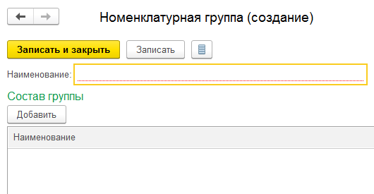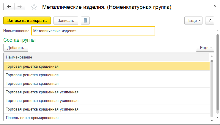 Если это не первая запись в номенклатуре, то посредством опции «Добавить» вносим ее к ранее созданному списку. Допустим еще один вариант. При добавлении нового элемента номенклатуры в его карточке выбирается нужная группа.