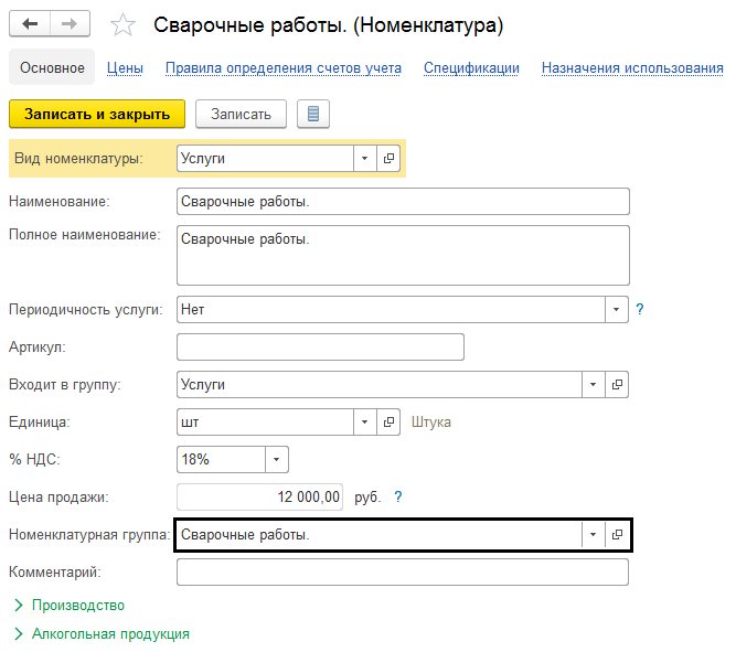 Аналогично при оказании услуг в документе «Реализация услуг: Акт» указанная в карточке номенклатурная группа «Сварочные работы» учтена в бухгалтерской записи.