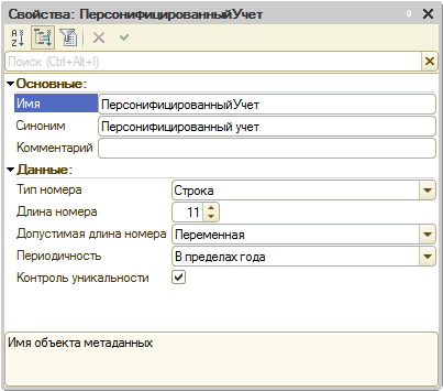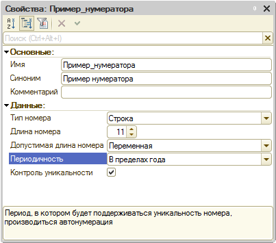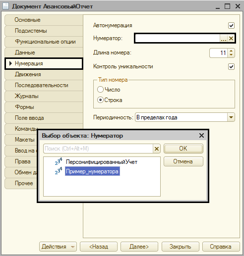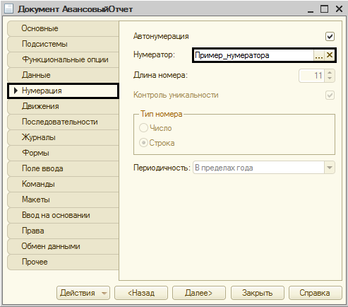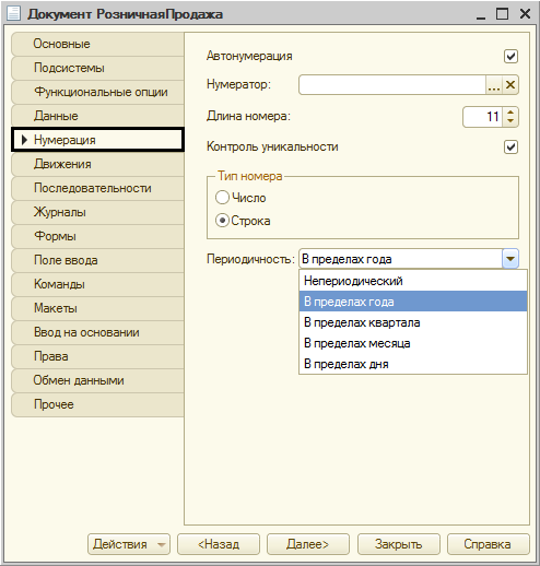 Документ, который мы хотим обработать, следует открыть в соответствующем варианте «Конфигуратор», далее через закладку «Нумерация» просмотреть нужные настройки. В частности, там есть галочка на автонумерацию, контроль для длины номера и уникальности и поле "Периодичность".