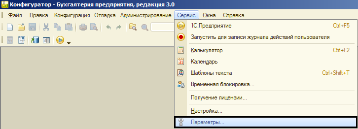 Затем выбираем вкладку «Сервис» - «1С:Предприятие».