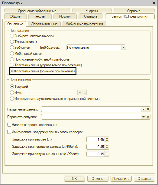 Запуск обработки производится в конфигурации управляемое приложение. Активируется режим «Толстый клиент (обычное приложение)» в программе 1С 8.3, путем изменения режима запуска в Конфигураторе (меню «Сервис» - «Параметры»).