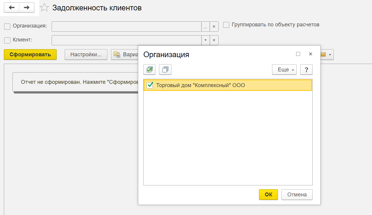 - Выбрать отдельного контрагента или снять галочку в графе "Клиент" - в таком случае документ будет сформирован по всем клиентам.