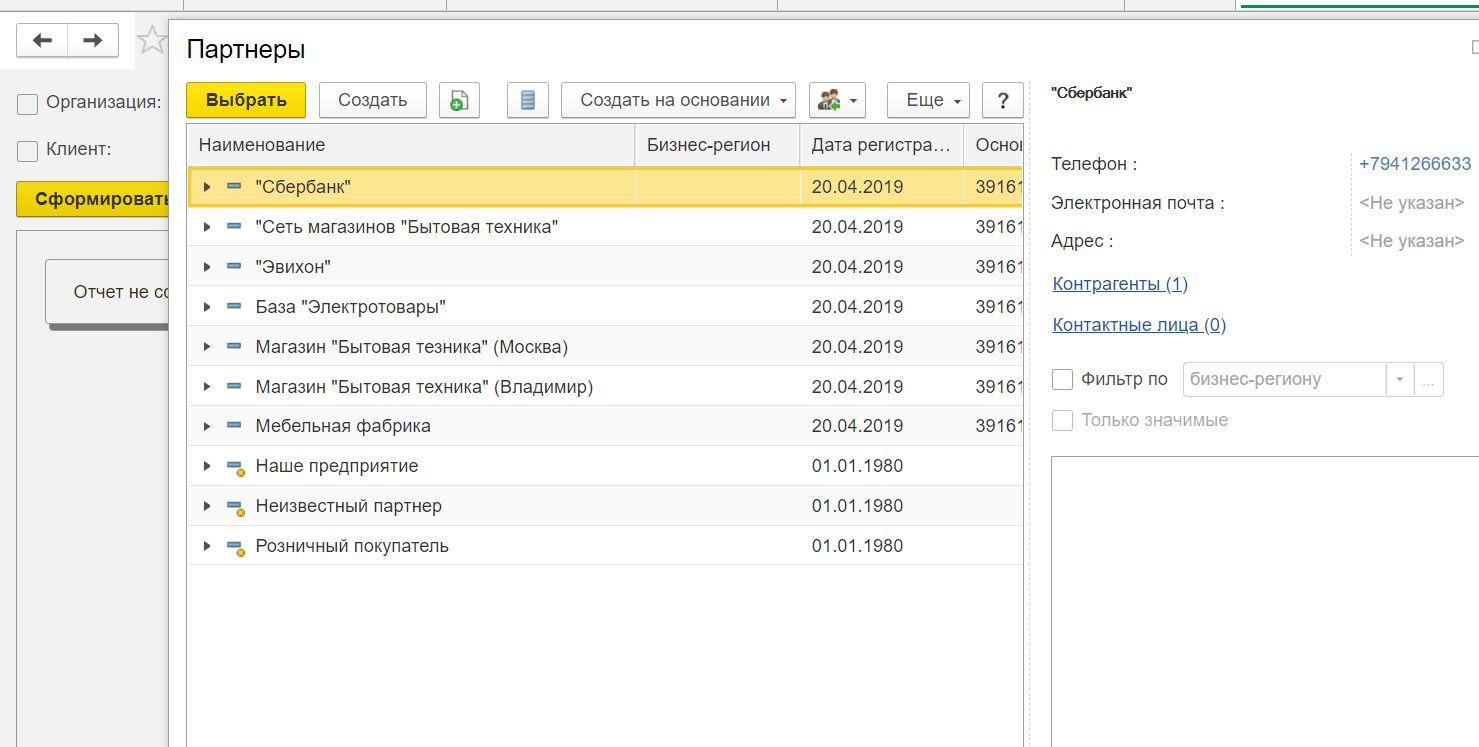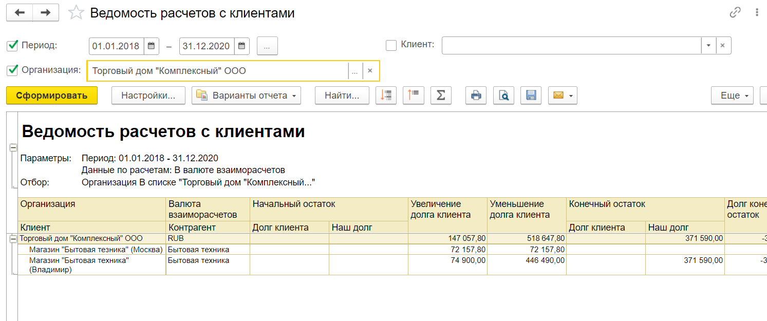 - Контрагента. Если необходимо отразить документ со всеми клиентами, снимите галочку и обратитесь к кнопке "Сформировать".