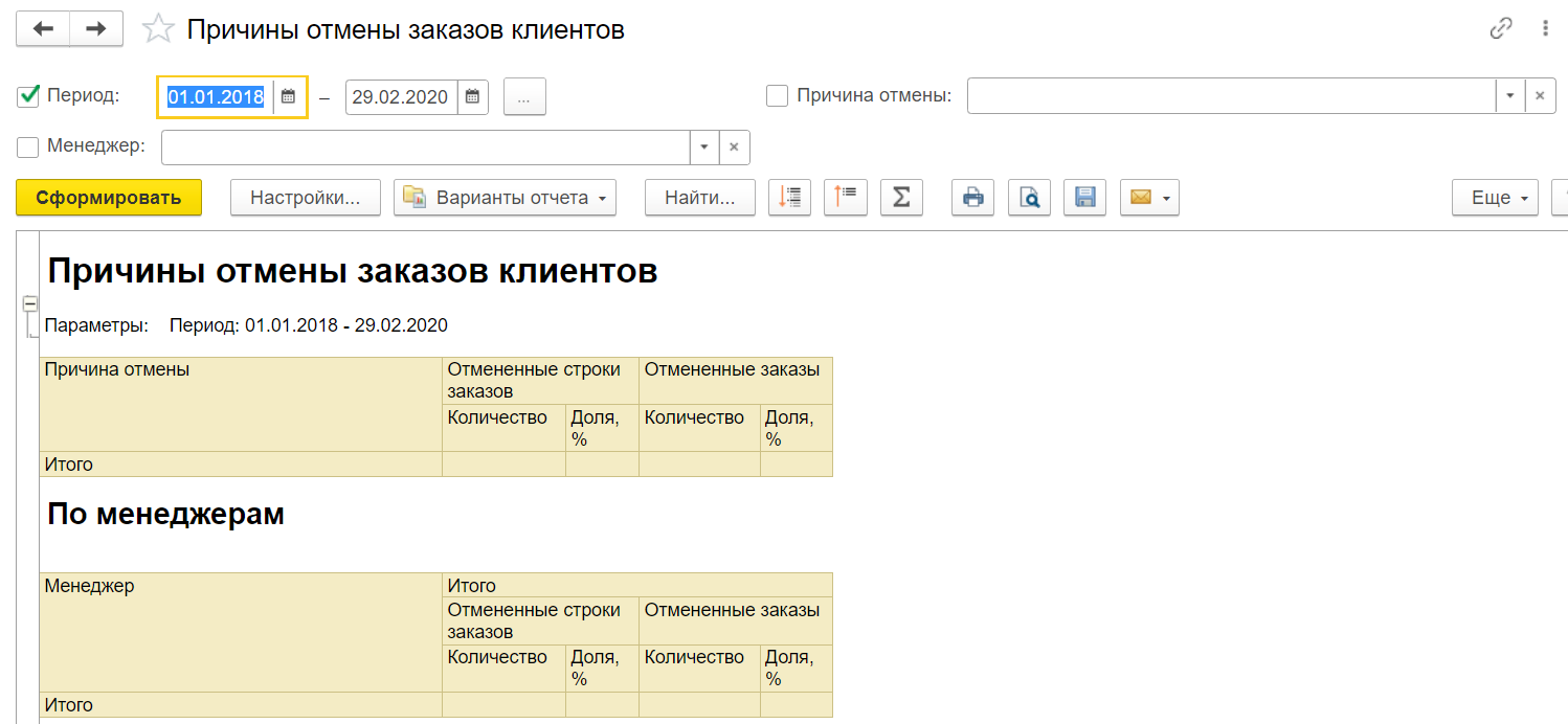 "Причины отмены заказов" – документ, позволяющий эффективно улучшать сервис и контролировать качество обслуживания клиентов компании. Документ содержит информацию о причинах отказа как на заказ в целом, так и на определенные товары за выбранный период. Кроме того, отсортировать данные можно по ценовым группам товаров и менеджерам.