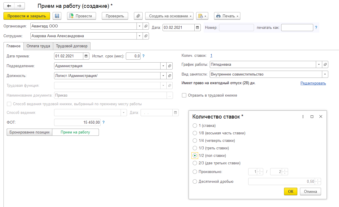 Отражение в 1С работы сотрудника на неполной ставке