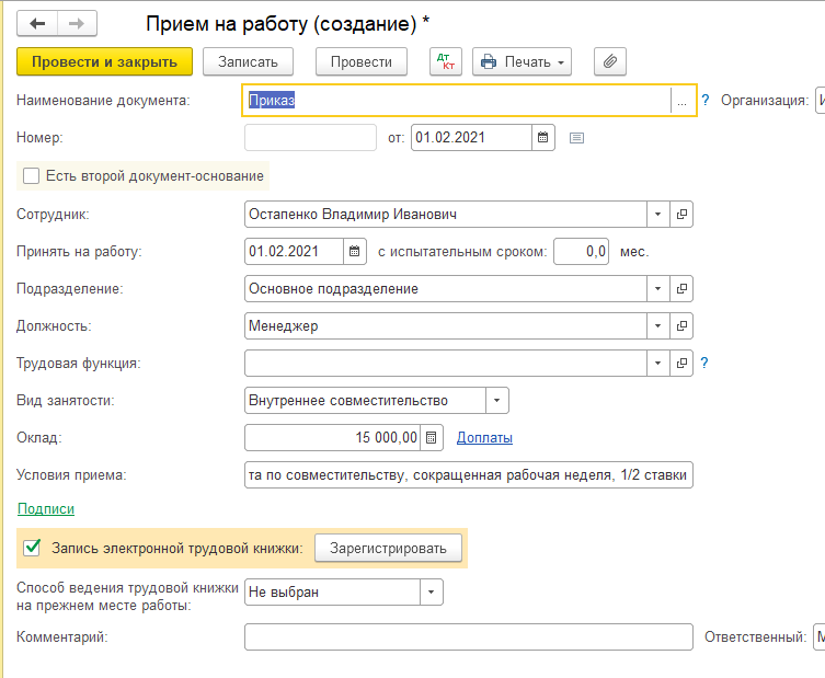 Прием на неполную ставку в 1С:ЗУП
