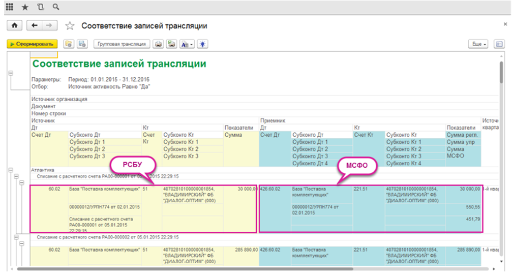 Соответствие записей трансляций по стандартам РСБУ и МСФО в БИТ.ФИНАНС