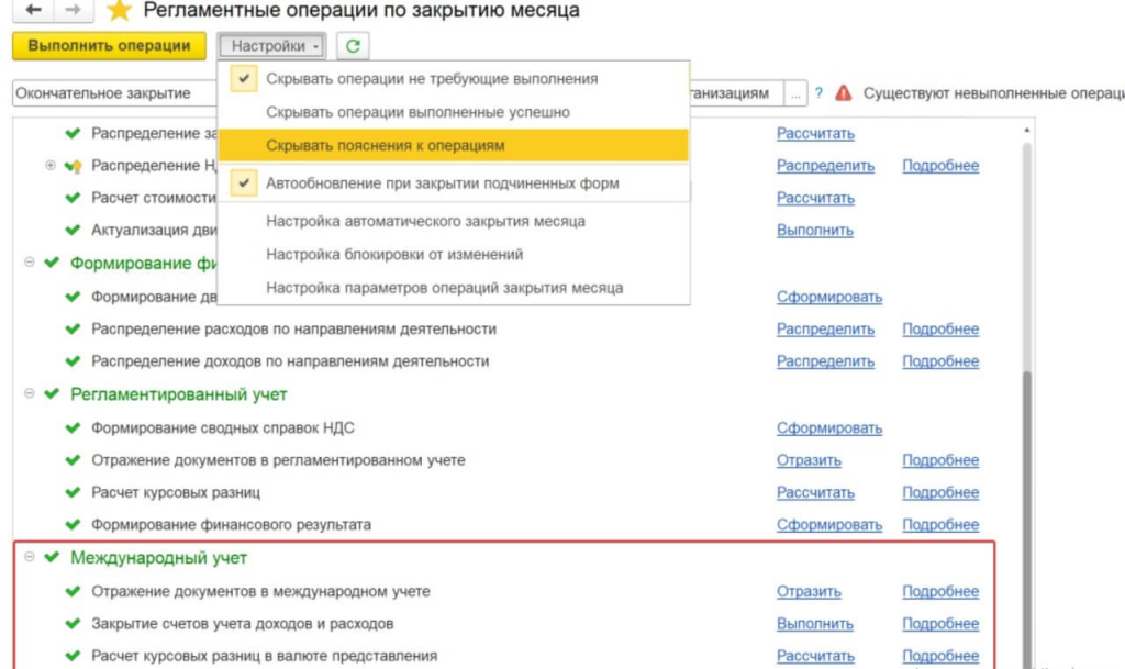 Отдельный механизм закрытия может применяться для разных видов учета — РСБУ, МСФО, бюджетирования и управленческого учета. Алгоритмы закрытия настраиваются независимо для каждого контура, что обеспечивает гибкость и позволяет адаптировать систему под задачи конкретной компании.