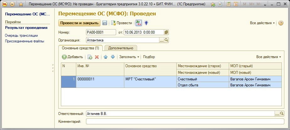 Документ «Перемещение ОС (МСФО)» в БИТ.ФИНАНС