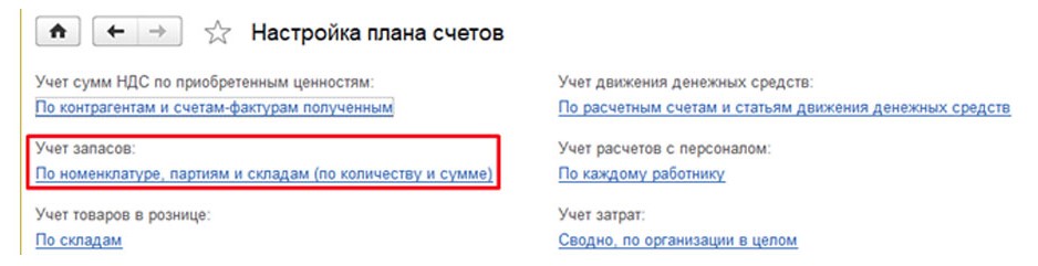 В обоих вариантах, перейдя по ссылке «Настройка плана счетов», пользователь попадает в окно, где нужно найти вкладку «Учет запасов». В названии ссылки, относящейся к этой вкладке, будут отображены текущие настройки раздела. При включенной опции партионного учета там будет надпись о форме учета «по номенклатуре, партиям…» (как показано на рис. 4). Если же опция отключена, слова «по партиям» будут отсутствовать. Чтобы изменить настройки, нужно просто нажать на ссылку.