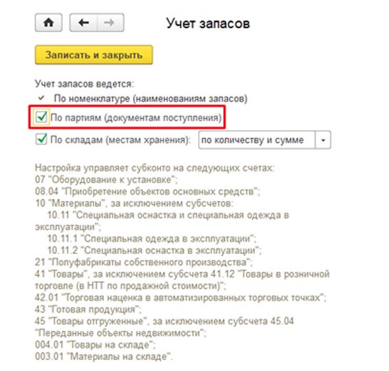 Откроется окно «Учет запасов». В нем нужно найти флажок, которым отключают или включают учет по партиям. После внесения изменений в настройки программа удаляет или устанавливает субконто «Партии» для бухгалтерских счетов ТМЦ. И в форме настроек плана счетов, и непосредственно в плане счетов появится информация о внесенных изменениях.