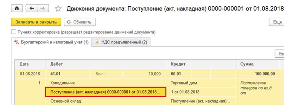 Сначала нужно создать, заполнить и провести документ поступления, затем проверяют выполненные бухгалтерские проводки. В качестве второго субконто счета 41 будет указана партия – это и есть документ поступления товаров.