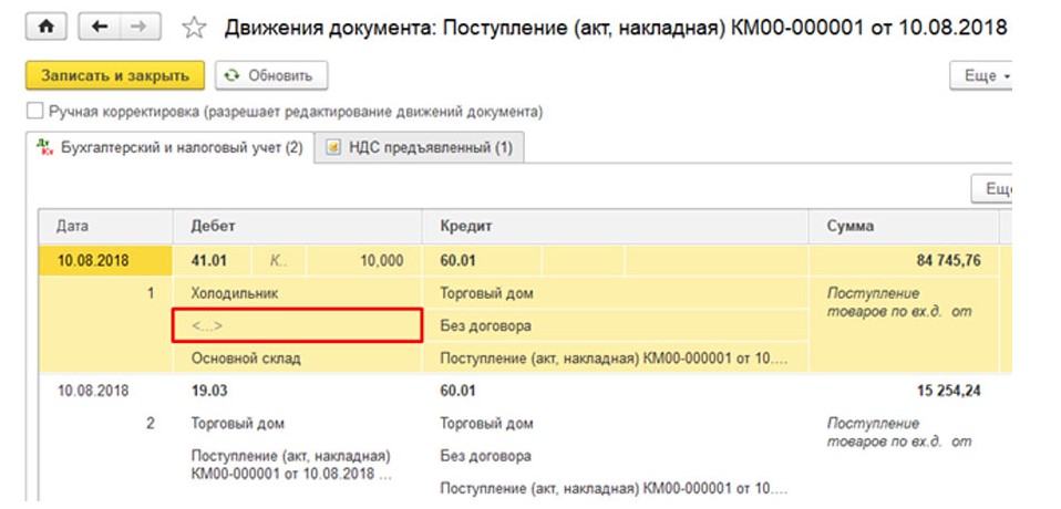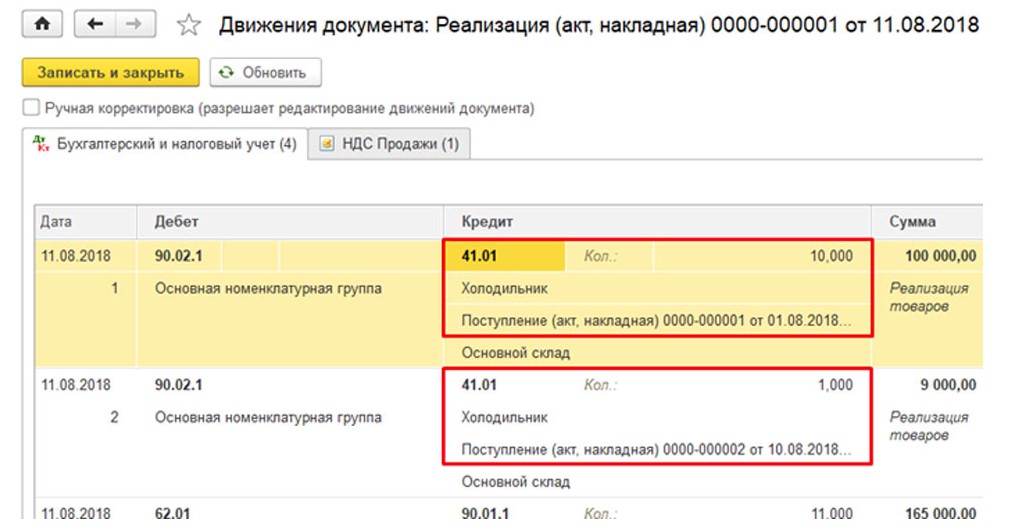 Документ заполняют и проводят. Движения документа по бухгалтерским счетам позволяют увидеть, что сначала программа списала первую партию, состоящую из 10 холодильников (как субконто счета 41 показан документ поступления №1). После этого понадобилась списать еще один холодильник. Программа взяла его из второй партии, которая поступила позже (субконто – документ поступления №2).