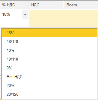 Значение вида ставки НДС - Поле ввода. При выборе реквизита в форме данный элемент обведен при помощи рамки синего цвета. Для больших списков перечислений удобно пользоваться такой настройкой, а для перечислений, в которых выбор состоит из двух значений, более приемлема настройка выбора в виде переключателя.