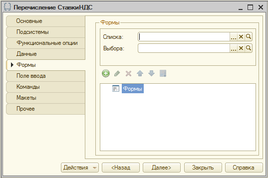 Формы выбора перечисления представлены в виде формы списка и формы выбора. Абсолютно каждому перечислению можно задать форму выбора и правила формирования выбора перечисления, формирования списка.