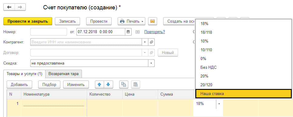 Требуется открыть программу и проверить, как отразилось изменение «Ввод нового значения перечисления ставки НДС». Открываем в документе «Счет» выбор значения ставок. В значении выбора возникло созданное нами значение «Наша ставка».