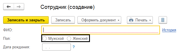 Если ставки НДС в документе были представлены как открывающийся список, то в справочнике «Сотрудники», при вводе нового работника, нам будет предложено установить переключатель «Пол». Это тоже элемент перечисления, потому что мы выбираем из списка.