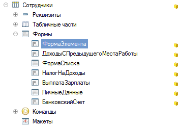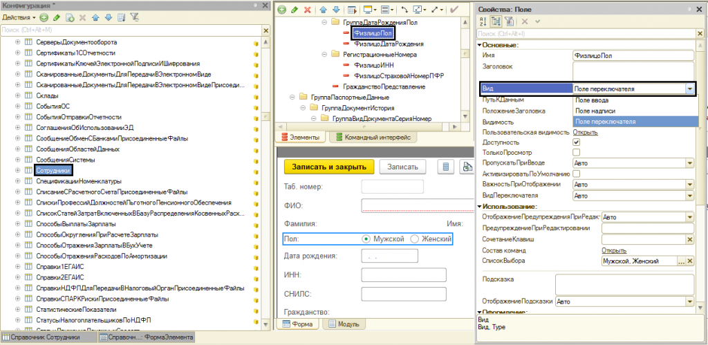 Чтобы посмотреть настройку их отображения, потребуется обратиться к тому элементу, где перечисление применяется. В нашем примере это справочник «Сотрудники». После его открытия, в дереве метаданных программы мы видим его настройки. Например, выбор пола - ФизлицоПол, и вид - «Поле переключателя». Поэтому в справочнике мы видим его в таком виде.