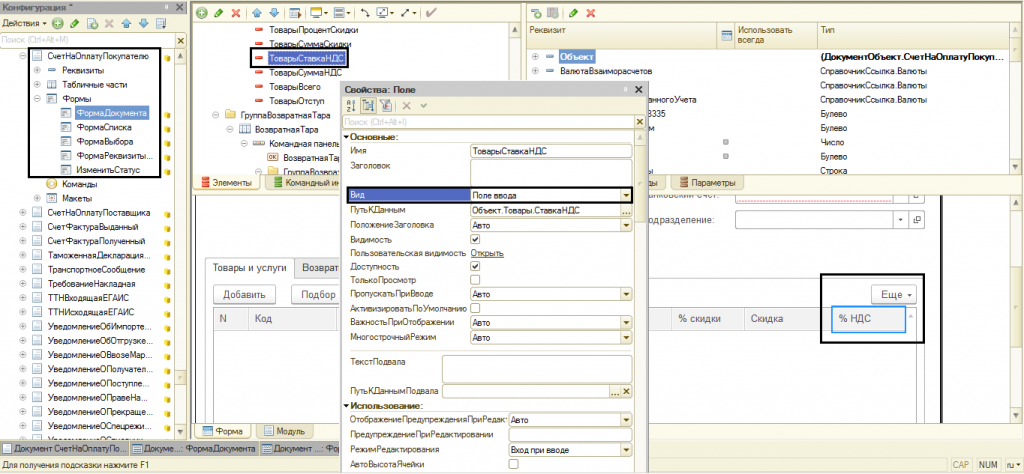 Проведем сравнение, как выполнен ввод значения перечисления, рассматриваемого в примере - НДС в документе «Счет на оплату покупателю». Для этого найдем данный элемент в дереве метаданных, но в списке документов, и посмотрим его форму.