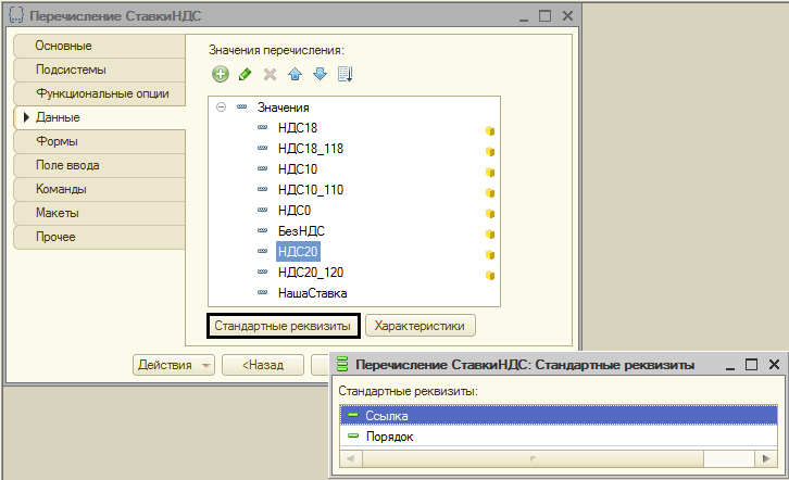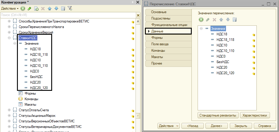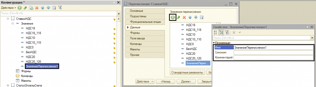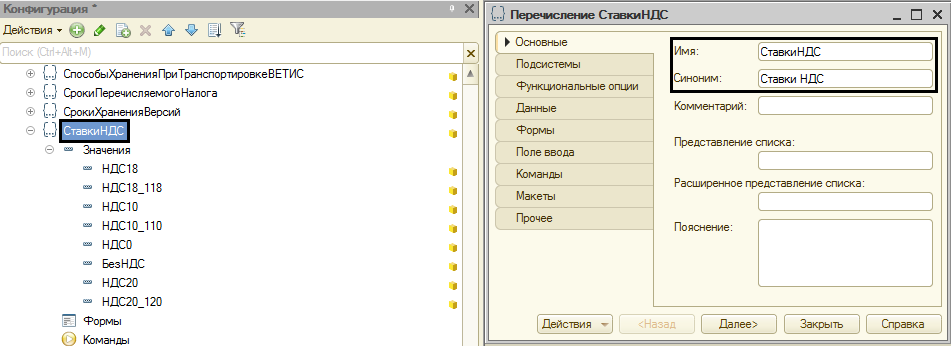 К значению перечисления приложение может обращаться напрямую, применяя присвоенное ему имя. Посмотрим, как выглядят перечисления изнутри. В качестве примера найдем перечисление «Ставки НДС» и откроем его. На вкладке «Основные» пишется имя перечисления и синоним объекта, применяемый для его описания в приложении.