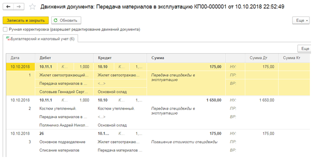Таким образом сформируются проводки по двум балансовым счетам: 10.11 и 10.10 и дебет забалансовых счетов, используемых для учета ценностей. А стоимость жилета светоотражающего будет погашена при передаче в эксплуатацию.