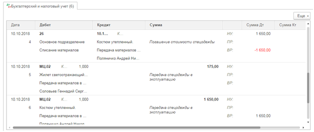 При этом погашение стоимости спецодежды в соответствие со способом отражения будет произведено только в налоговом учете. По этой причине появится временная разница между данными бухучета и налогового.