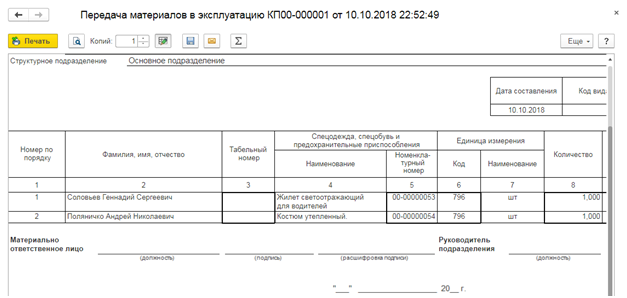 Предметы категории МПЗ отражаются на спецсчете 10.10 обозначенном как «Спецодежда и спецоснастка на складе». После создания оборотно-сальдовой ведомости легко отметить, что на балансе отражаются светоотражающие жилеты в количестве 10 штук и утепленные костюмы в количестве 15 штук.