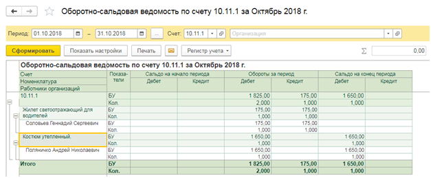 После того как будет создана оборотно-сальдовая ведомость для интересующего счета «Спецодежда в эксплуатации» номер 10.11.1, можно будет увидеть, что «жилеты светоотражающие» списались после выдачи и на конец месяца нет остатков. При этом костюм утепленный числится за конкретным ответственным лицом.