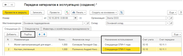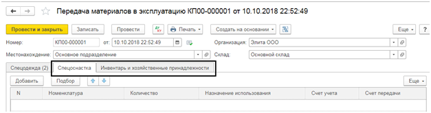 Начинать необходимо с выдачи материалов в разделе «Передача в эксплуатацию», раздел находится в меню «Склад-Спецодежда и инвентарь».