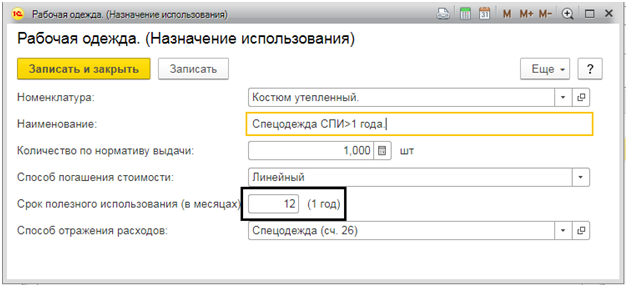 Важно учитывать эти особенности при внесении данных о назначении использования. Например, светоотражающий жилет эксплуатируется менее 12 месяцев, что предусматривает проведение списания в соответствие с правилами первой группы.