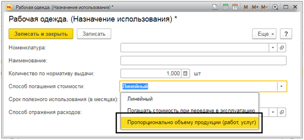 Существует еще один вариант гашения, используемый исключительно по отношению к спецоснастке. В этом случае исходят из объема продукции или же проделанных работ или оказанных услуг в равных пропорциях. При использовании этого способа требуется ежемесячное внесение данных в документ «Выработки материалов».