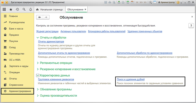 Для того, чтобы открыть обработку, вам нужно перейти в раздел «Администрирование», затем выбрать «Обслуживание» и перейти по ссылке «Поиск и удаление дублей».