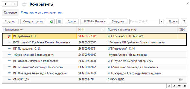 Теперь давайте посмотрим, что с дублями произошло в справочнике. Для этого выберете «Меню – Справочники – Покупки и продажи». Вы можете заметить, что дубль был помечен на удаление. Кроме того, можно заметить, что ИНН у «двойников» выделен ярко красным. Дело в том, что программа имеет контроль совпадений по ИНН.
