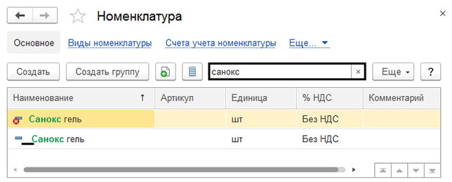 Теперь нужно перейти в «Номенклатуру» для этого выбирайте «Меню – Справочники – Покупки и продажа» и выполнить поиск по названию, так как зрительно похожие название не отображаются. Если присмотреться внимательно, то можно заметить, что у одного из элементов перед названием стоит пробел. Из-за этого пользователь не может найти его в списке и создал новый элемент. Причем эта ситуация встречается довольно часто.
