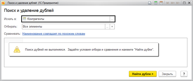 Для того чтобы искать и удалять дубли в программе 1С Бухгалтерия есть одноимённая обработка. Давайте рассмотрим, как она работает.