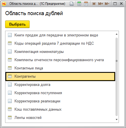 В появившемся списке вам нужно выбрать область, в которой будете искать дубли. Мы выбираем справочник «Контрагенты».