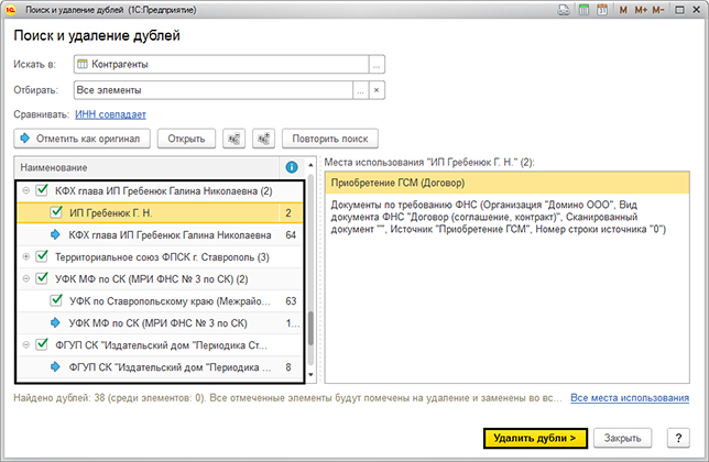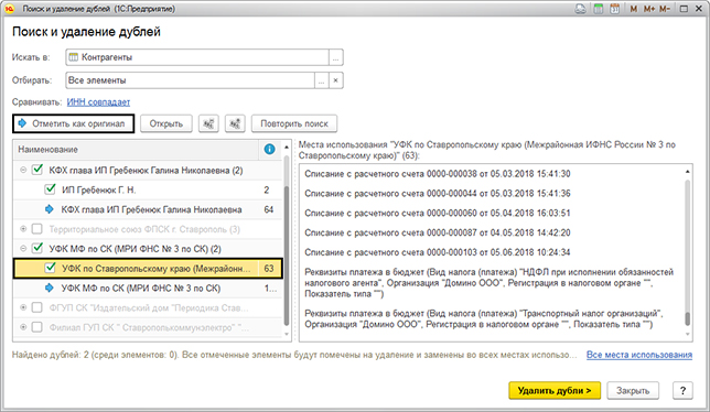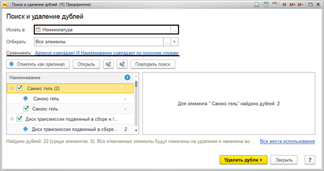 Тот элемент, который имеет наибольшее число записей, отмечается как оригинальный и выделяется синей стрелочкой. Если какие-то объекты вы не планируете обрабатывать, то снимите с него галочку. Если вы хотите изменить объект при удалении, то нажмите на кнопку «Отметить, как оригинал».