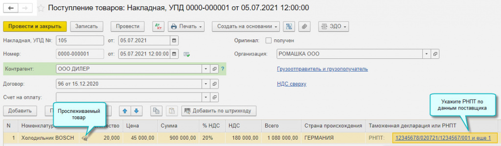 Программа «1С: Бухгалтерия 8», начиная с обновленной версии 3.0.95, содержит в себе добавленную возможность определения РНПТ для прослеживаемых товаров во всех оформляемых при его поступлении документах.
