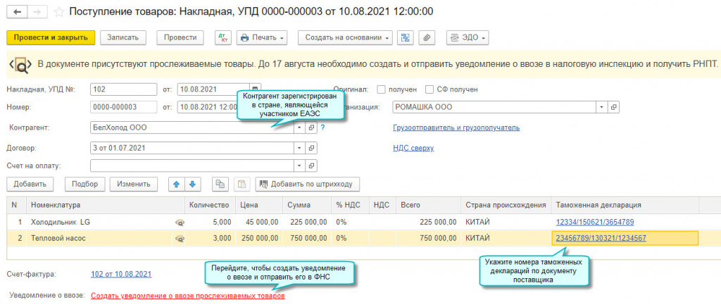 В этом случае действует напоминание о том, что необходимо получить РНПТ в отделе ФНС в период 5 рабочих дней, если получило отражение поступление прослеживаемых товаров из стран, входящих в состав ЕАЭС.