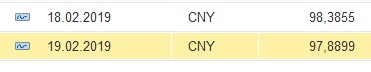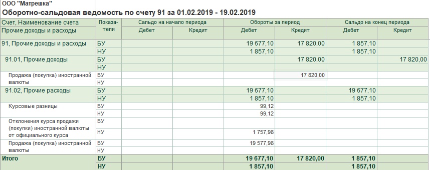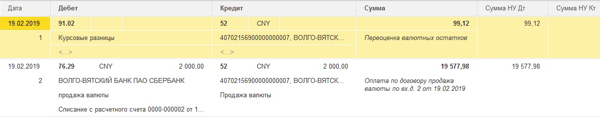 Обращаем внимание на строку «Переоценка валютных остатков». Утилита определила, какая сумма значилась по состоянию на прежнюю отчетную дату. В нашем случае, прежнее движение зарубежных финансов проводилось 18 февраля 2019 года, когда курс составлял 98,38 за десять юаней, то есть 2 000 юаней разделить на 10 (кратность) и умножить на 98,38 (по курсу), получим 19 677,10 рублей.