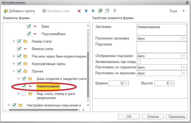 - Выберите подраздел «Прочее», установите флажок на подпункте «Наименование». Сохраните внесенные изменения.