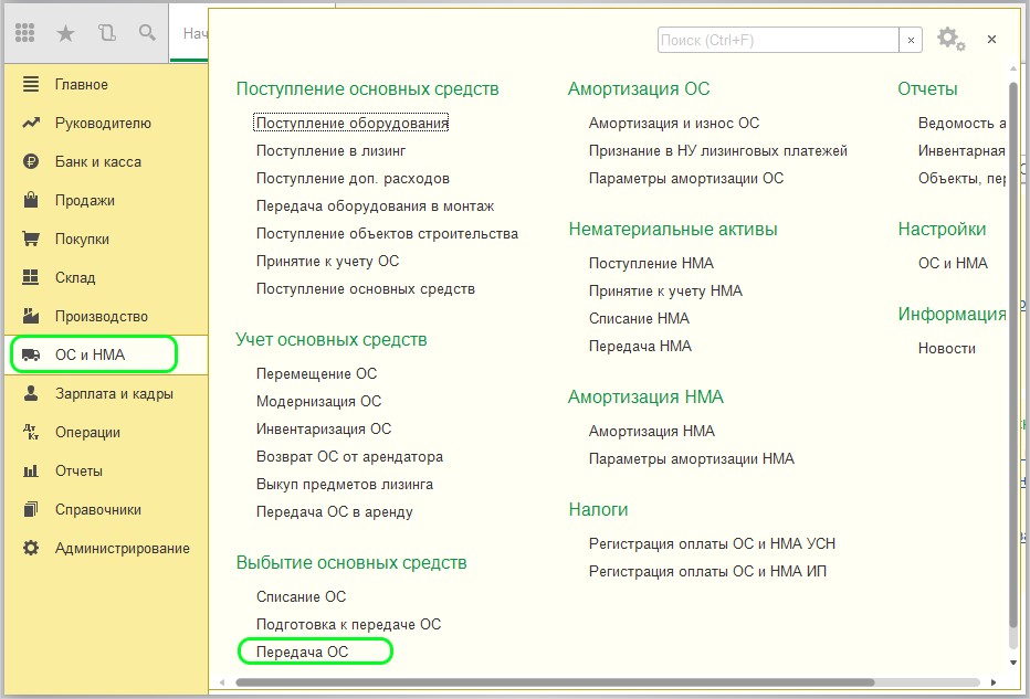 Обратите внимание! Продажа в обоих случаях будет осуществляться посредством использования документа «Передача ОС», который находится в категории «Выбытие основных средств» во кладке меню «ОС и НМА».