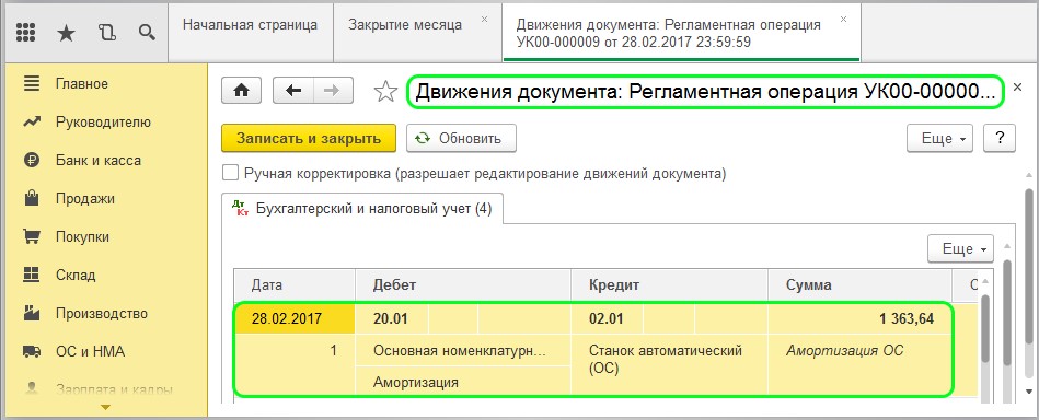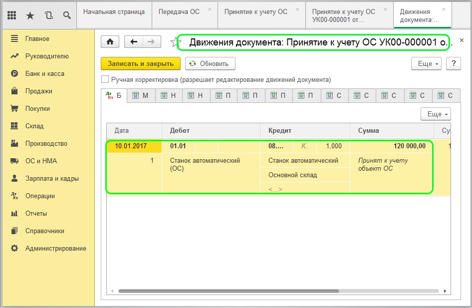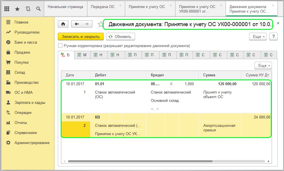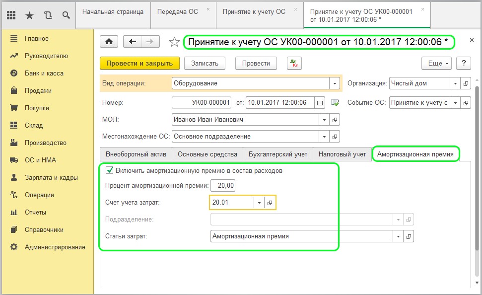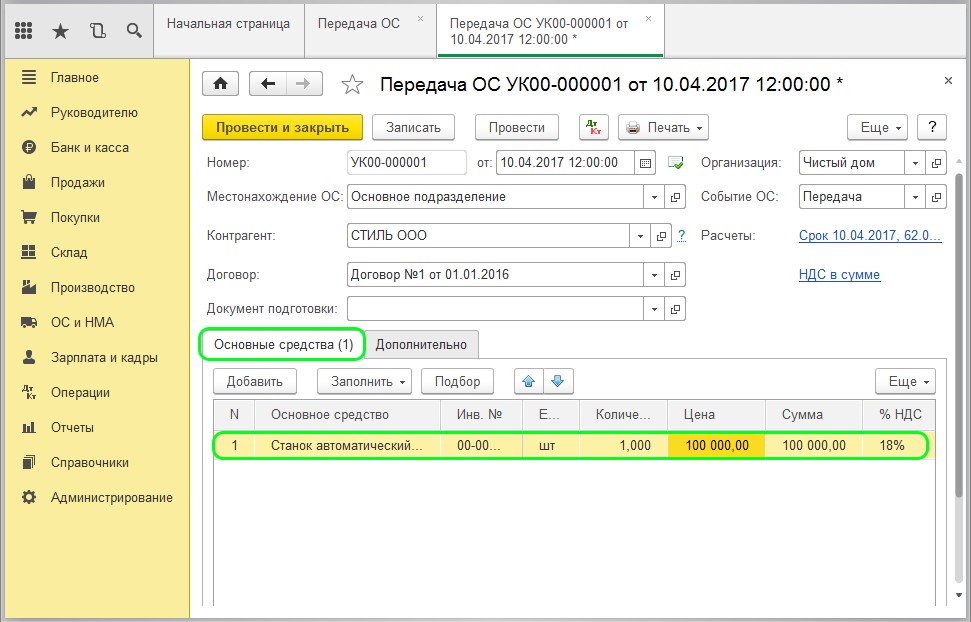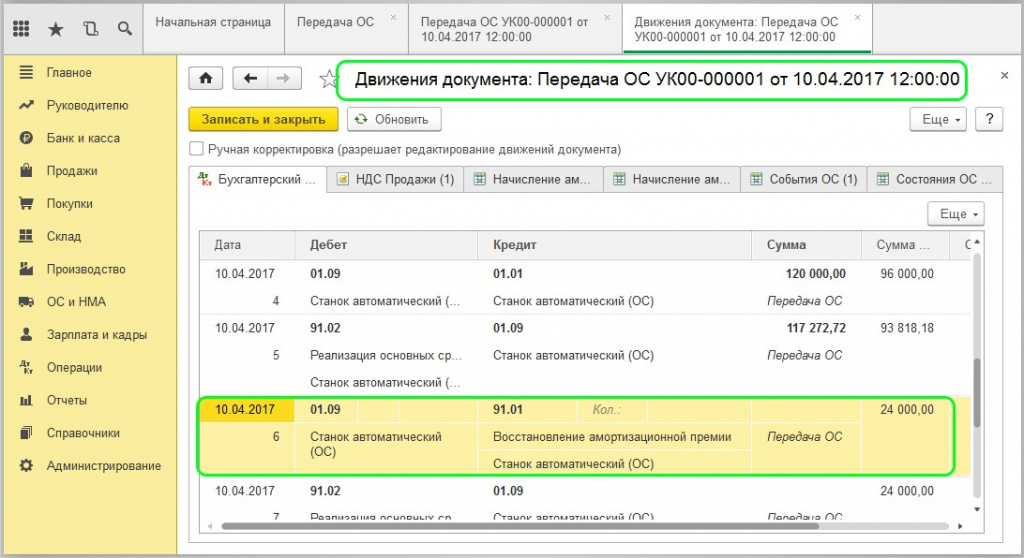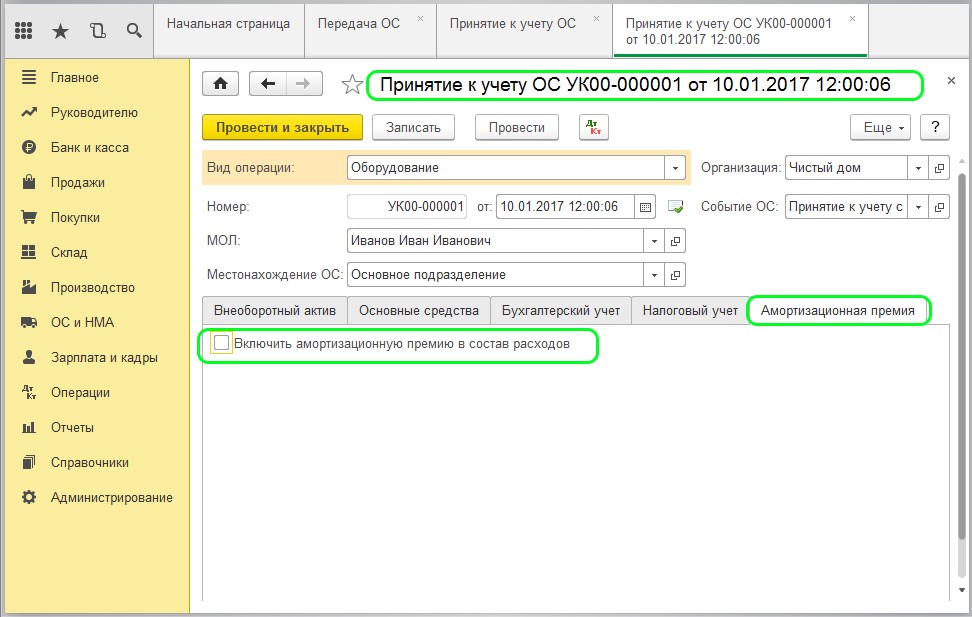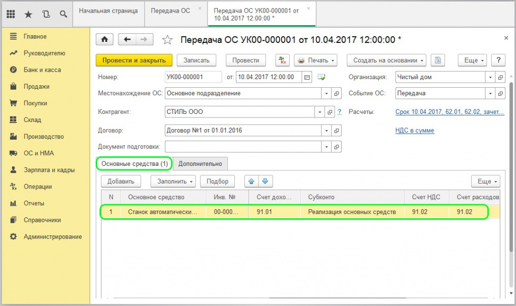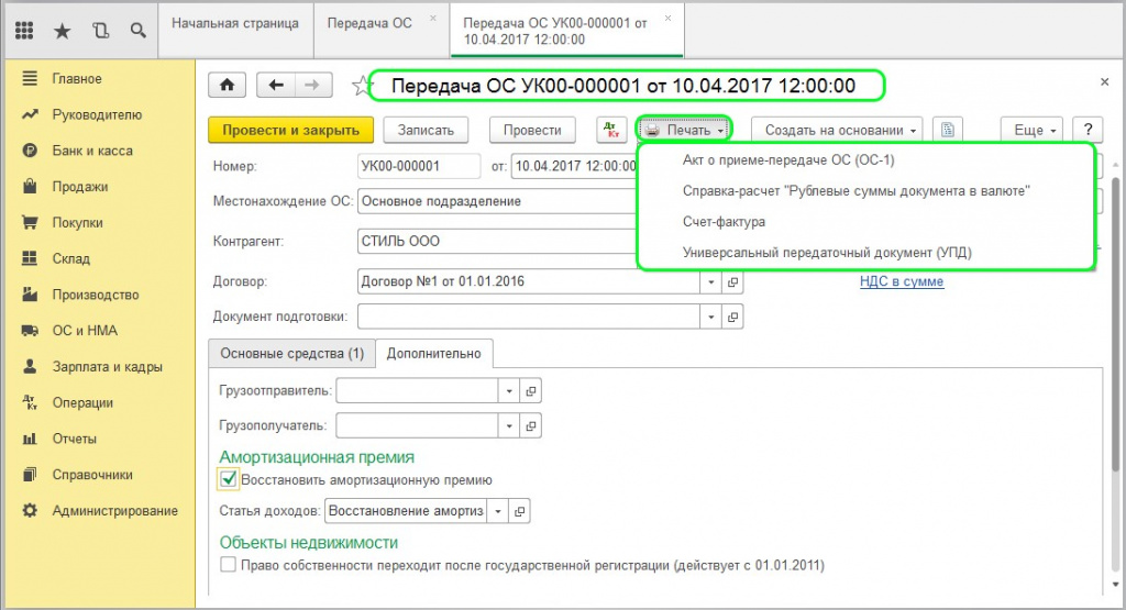 Рассмотрим оформление продажи основного средства в 1С на том же примере, но уже отражающим по НУ начальную стоимость амортизационной премии: