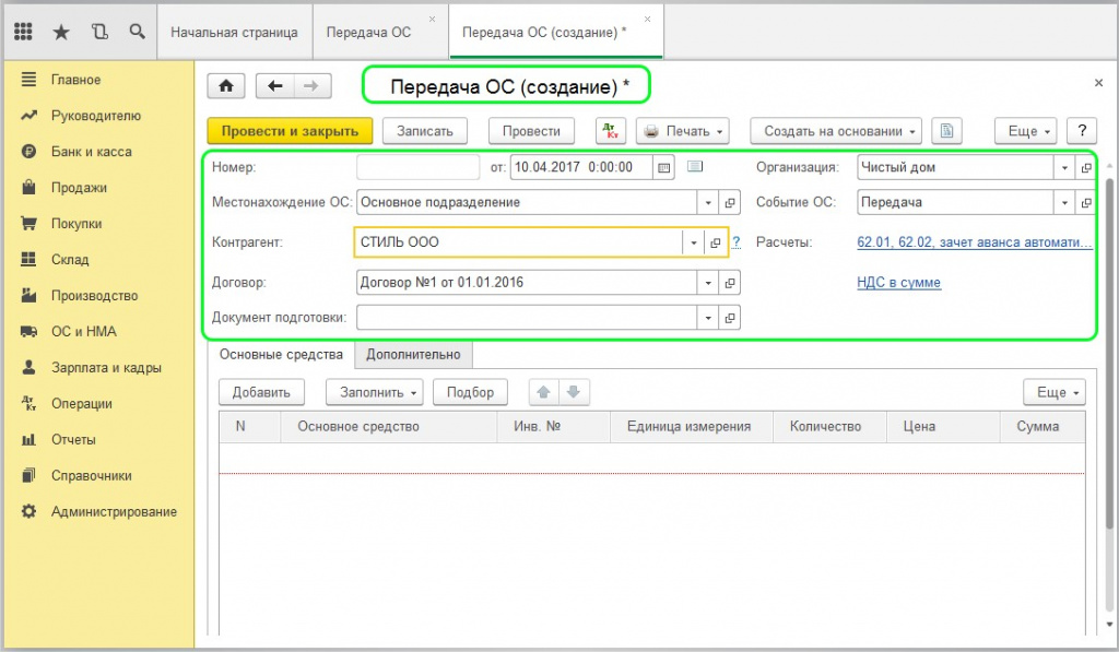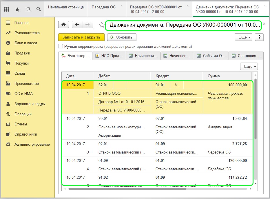 Как итог было выполнено начисление амортизации и по НУ, и по БУ при одновременном погашении всех возникших временных разниц. Реализацию ОС осуществляем использованием документа «Передача ОС» (открываем вкладку «ОС и НМА», выбираем раздел «Выбытие ОС»):