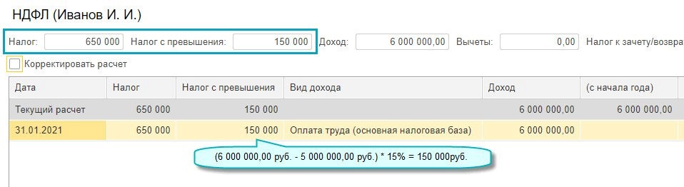 С 2021 г. с доходов более 5 млн. руб. НДФЛ нужно удерживать по повышенной ставке 15%, а не по обычной в 13%. Соответственно, с доходов в 5 млн. руб. налог будет удерживаться в размере 650 тыс. руб. (13%) и далее плюс 15% с доходов больше 5 млн. руб. (Закон от 23.11.2020 г. № 372-ФЗ).