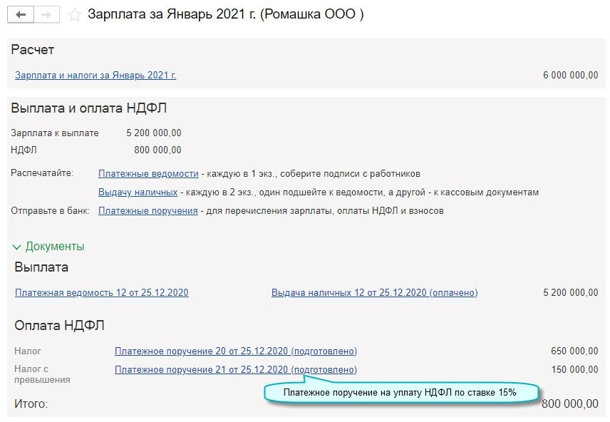 Кроме того, в программе теперь имеется возможность в автоматическом режиме заполнять платежное поручение на перечисление НДФЛ по тарифу 15%. Делается это, когда формируются документы на выплату.