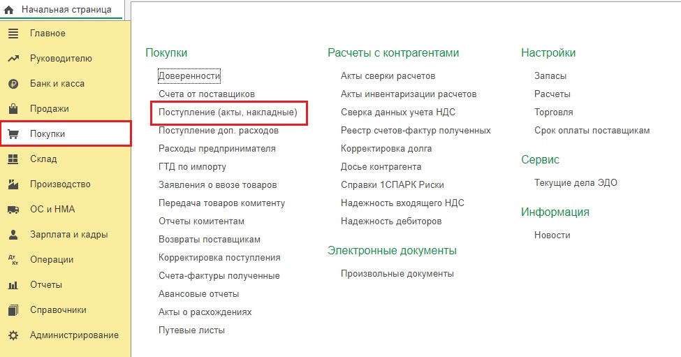 В открывшейся вкладке требуется кликнуть «Поступление» и выбрать из выпадающего перечня «Услуги (акт)». Далее заполнить документ сведениями из полученного акта.